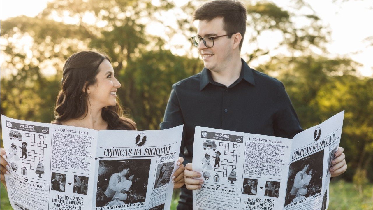 O casal convida para o casamento no dia 15 de fevereiro de 2026, no salão Bella Faria Eventos, em Cedral/SP. Será a partir de 18:00h. Não vai perder, né?